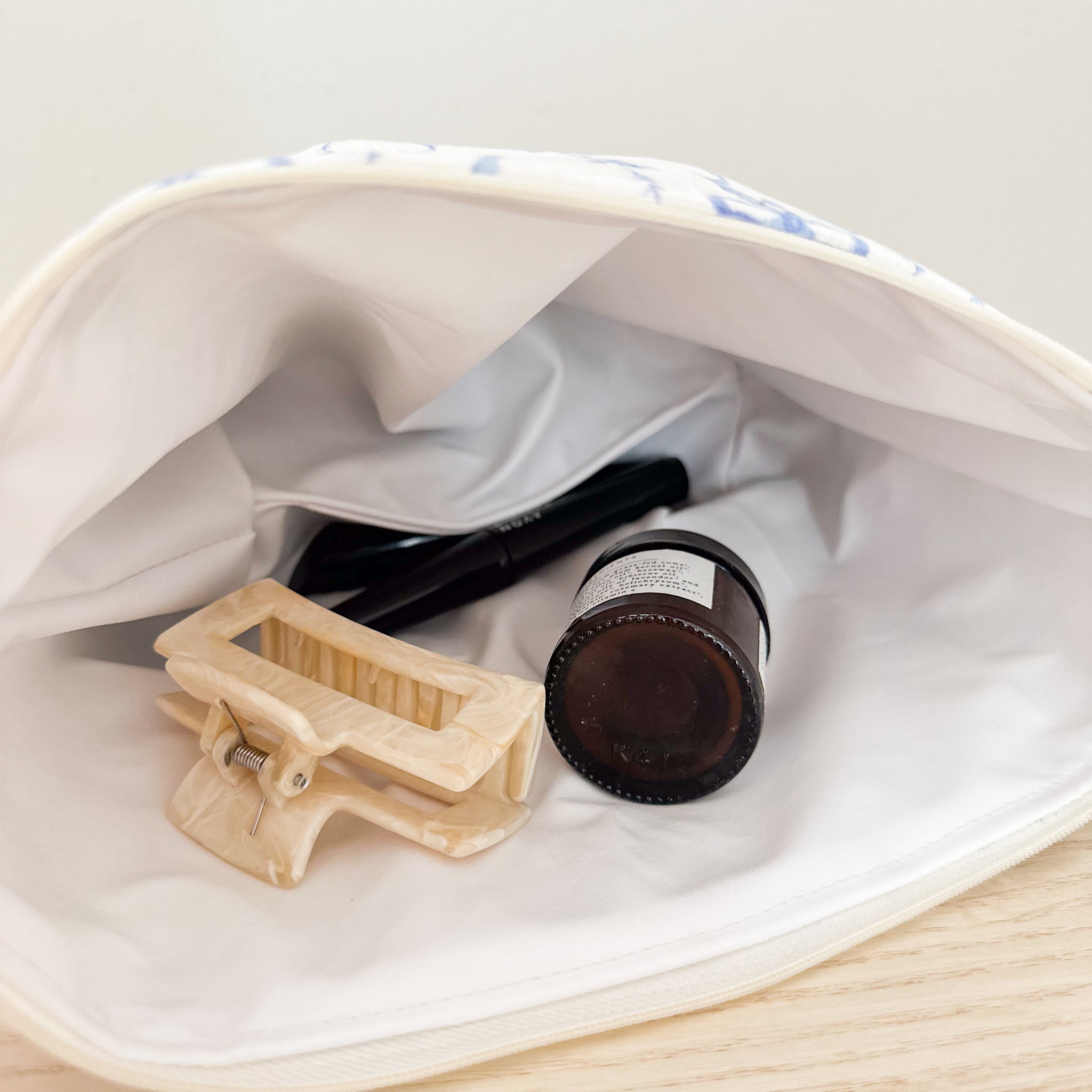 This zippered pouch with a flat bottom features a patterned canvas fabric with a vegan leather bottom and is perfect to hold all of your travel toiletries for your next adventure! Lined with a water resistant lining that's easily wiped clean or for maximum clean up just toss the whole bag in the washing machine and line dry.