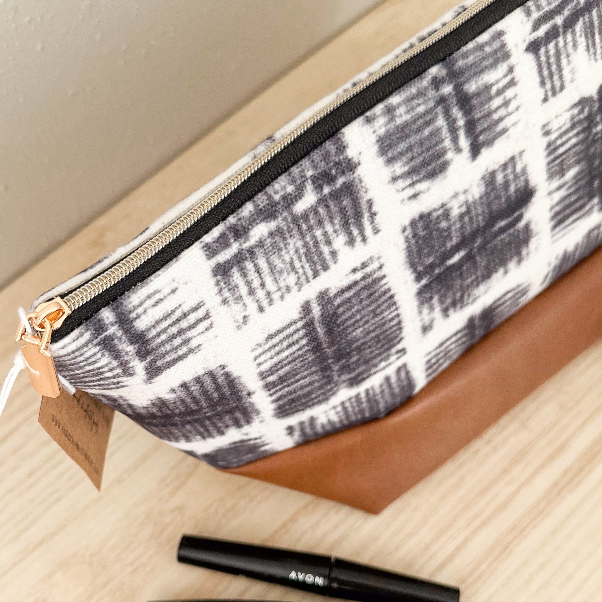 This zippered pouch with a flat bottom features a patterned canvas fabric with a vegan leather bottom and is perfect to hold all of your travel toiletries for your next adventure! Lined with a water resistant lining that's easily wiped clean or for maximum clean up just toss the whole bag in the washing machine and line dry.